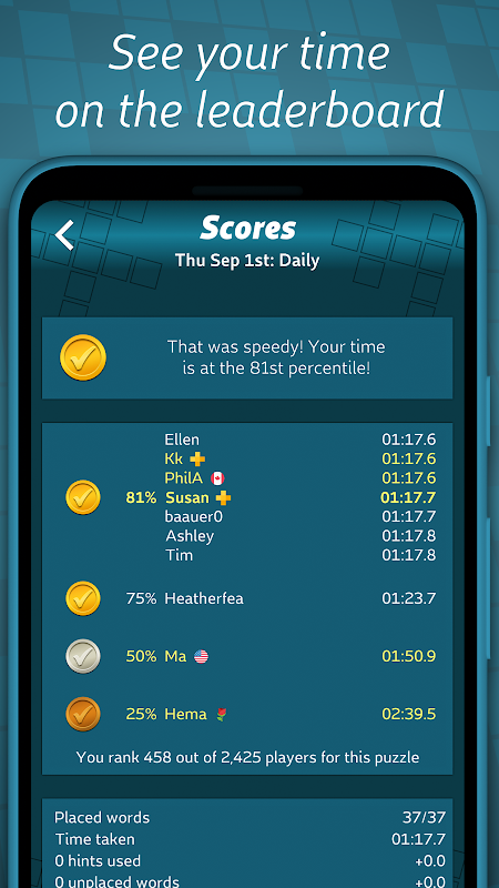 Astraware Kriss Kross ti dà accesso a giocare a uno qualsiasi dei nostri quattro puzzle giornalieri: raggiungi la vetta della classifica globale completando il puzzle nel minor tempo possibile! Per più di una sfida c'è un puzzle Weekender disponibile ogni venerdì con una griglia ancora più grande. Il gioco include anche 60 puzzle incorporati di varie dimensioni e difficoltà.