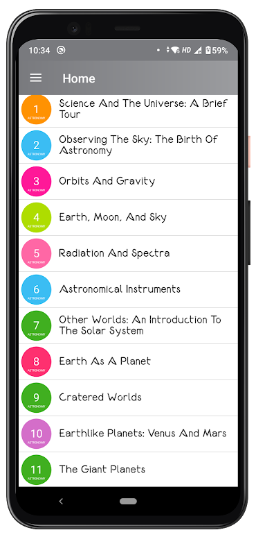 1. Scienza e universo: un breve tour 2. Osservazione del cielo: la nascita dell'astronomia 3. Orbite e gravità 4. Terra, luna e cielo 5. Radiazioni e spettri 6. Strumenti astronomici 7. Altri mondi: un'introduzione a il Sistema Solare 8. La Terra come Pianeta 9. Mondi Crateri 10. Pianeti simili alla Terra: Venere e Marte 11. I Pianeti Giganti 12. Anelli, Lune e Plutone 13. Comete e Asteroidi: Detriti del Sistema Solare 14. Campioni Cosmici e l'origine del sistema solare 15. Il sole: una stella da giardino 16. Il sole: una centrale nucleare 17. Analizzando la luce delle stelle 18. Le stelle: un censimento celeste 19. Distanze celesti 20. Tra le stelle: gas e polvere in Spazio