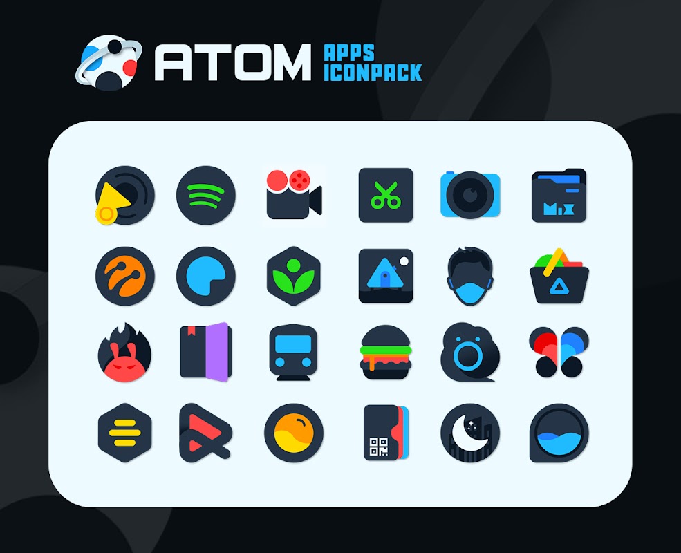 Il pacchetto icone Atom è progettato con l'atmosfera calda per un'immediata felicità visiva per la tua schermata iniziale con bellissimi colori e combinazione di colori neri.