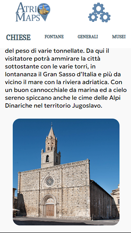 Atri Maps è una mappa virtuale della città Abruzzese di Atri, puoi leggere la storia e visitare i monumenti, chiese e musei che Atri ha da offrire. L'app traccia la tua posizione così potrai vedere se ti trovi vicino a qualche attrazione.