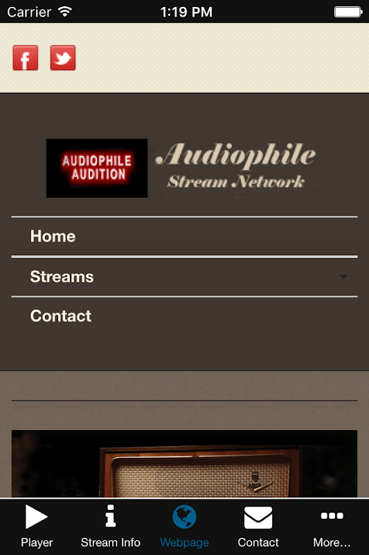 There is a player for each stream, with track and artist details from Last.fm, Facebook and Twitter integrations to the station, "Stream info" page with map of listeners. Artist biography for each stream and every track played. Links to the website.