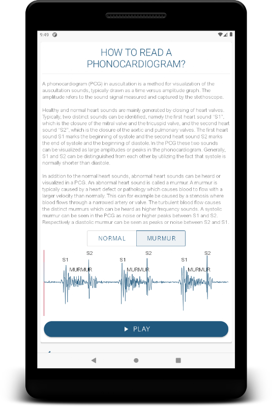 Questa applicazione ha lo scopo di aiutare studenti di medicina, medici, infermieri, professionisti del settore medico o altri interessati a sviluppare le proprie capacità di auscultazione e la loro comprensione dei fonocardiogrammi. L'applicazione include registrazioni di suoni cardiaci reali di oltre 50 pazienti pediatrici con diagnosi convalidata da un cardiologo e un ecocardiogramma.