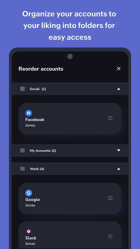- Crea cartelle per organizzare i tuoi account TFA a tuo piacimento. È possibile creare e riordinare separatamente le cartelle personali e di lavoro per un facile accesso. Puoi anche spostare gli account all'interno e tra cartelle.