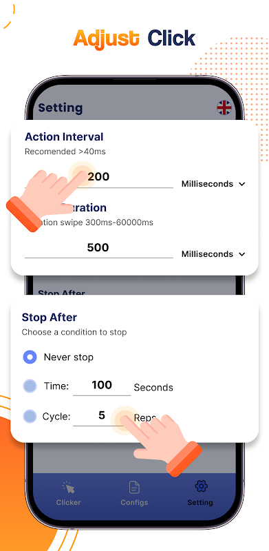 Definisci l'intervallo di clic, la durata e il numero di ripetizioni per ottenere l'automazione desiderata. Controlla la velocità dei clic automatizzati per soddisfare i requisiti di diverse app o giochi. Aumenta la velocità per azioni più veloci o diminuiscila per la precisione