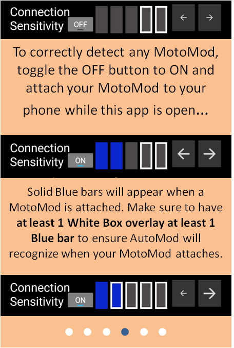This Auto Mod will work with any Moto Mod you attach to your Moto Z after you calibrate the app to your Mod's connection sensitivity. The Mod's connection strength will show in the five connection level bars by lighting up solid blue. Tap the app's sensitivity boxes (empty white bars) to meet with the Mod's connection strength (solid blue bars) by tapping the connection arrows.