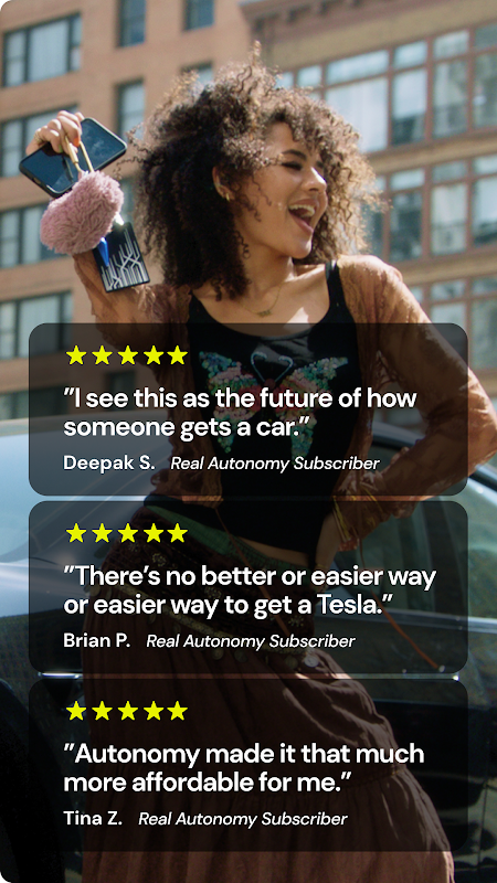 Quando ottieni un abbonamento auto mensile utilizzando l'app Autonomy, ottieni una Tesla senza molti dei tradizionali costi di proprietà, come tassi di interesse, ammortamento o manutenzione ordinaria. Invece, goditi un pagamento mensile inferiore che puoi mettere sulla tua carta di credito. Restituisci la tua auto elettrica in qualsiasi momento dopo un mese con un preavviso di 14 giorni, oppure continua a pagare mensilmente e guidala per tutto il tempo che desideri.