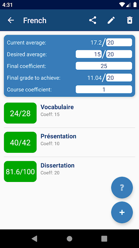 È un'app molto semplice che calcola le tue medie, oltre alla media complessiva e al voto minimo necessario per un esame finale per raggiungere la media finale desiderata in un corso. Utile se vuoi conoscere il tuo voto di superamento in un esame!