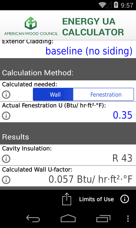 Per l'uso con il 2012 International Energy Codice del Codice Consiglio internazionale per la conservazione (IECC) o al Codice Residenziale Internazionale (IRC), questa applicazione fornisce soluzioni in legno per il metodo alternativo Total UA. Parete Opaco U-fattori sono calcolati sulla base di migliori prestazioni finestratura. In entrambi i casi un opaco muro o finestratura U-fattore sconosciuto può essere determinata. L'applicazione fornisce anche esigenze di isolamento richiesti in varie assemblee muro per raggiungere il muro U-factor opaco. Assemblee Muro includono 2x4 e 2x6 di legno inquadratura a 16 "e 24" oc spaziatura così come diverse opzioni di rivestimento e guaina. L'UA Energy Calculator è coerente con il disegno di AWC per il codice di accettazione (DCA) 7 - Requisiti Incontro Energia residenziale con struttura in legno di costruzione - 2012 IECC versione che fornisce modi per soddisfare economicamente il requisito residenziale del 2012 IECC.