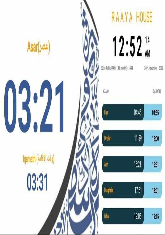Azan Clock è uno strumento super flessibile con un display moderno che mostra il conto alla rovescia di iqamath dopo che è stato chiamato azan..