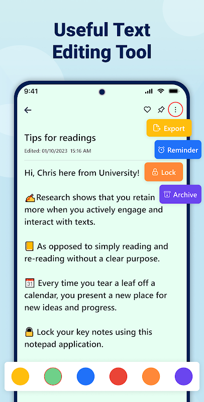 Questa è la migliore app per prendere appunti con un editor di testo facile da usare che supporta le opzioni di formattazione di base. Blocco note salva i tuoi file automaticamente, così non dovrai mai preoccuparti di perdere il tuo lavoro. Ottieni subito questa migliore app per blocco note per Android gratuitamente dal Play Store e semplificati la vita.