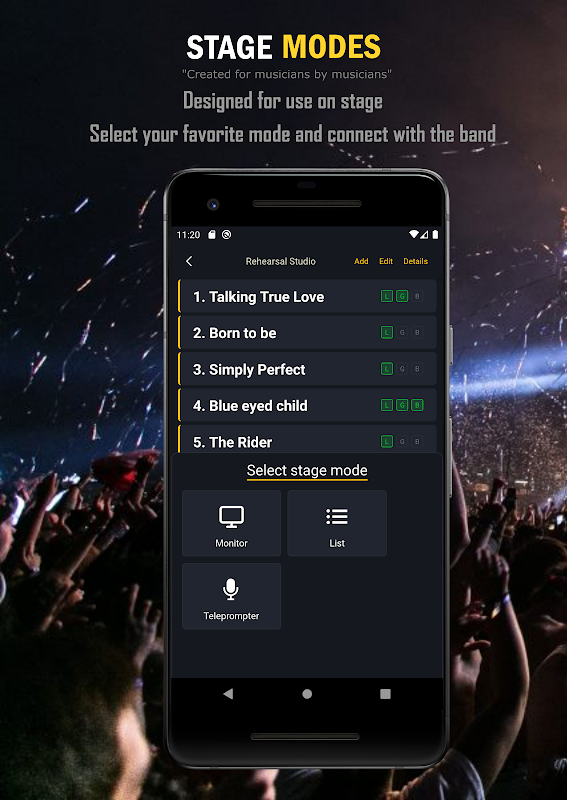 Collega i dispositivi della banda durante le prove e le esibizioni dal vivo. Mantiene la setlist sincronizzata in modo che tutti siano sulla stessa pagina.