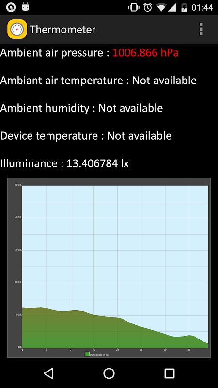 Non stupitevi se alcune misure non funzionano (visualizzato "Non disponibile"), è perché alcuni dispositivi mancano alcuni sensori (ad esempio, il Nexus 5 hanno solo il sensore del barometro, e il sensore luxmetro).