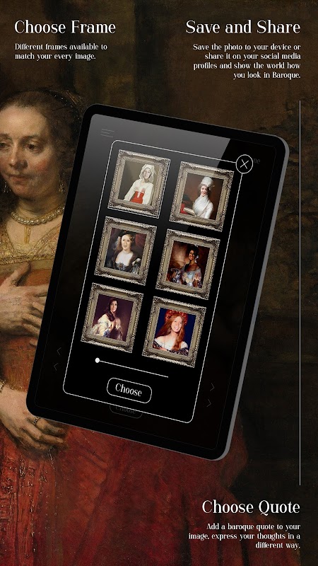 Anche i gentiluomini possono ora far' parte di barocco, poiché l'app aggiornata offre ritratti maschili per la modifica. Basta toccare la freccia rivolta a destra nella schermata principale e le maschere maschili sono lì per la tua scelta.