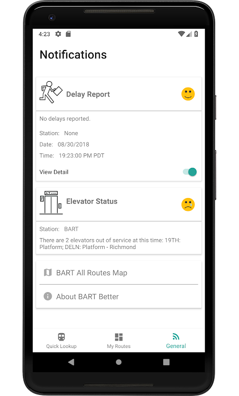 Bart meglio può essere utilizzato per tenere traccia calendario in tempo reale per il sistema BART (Bay Area Rapid Transit). È possibile utilizzare "Ricerca rapida" per ottenere informazioni di base, aggiungendo i tuoi percorsi preferiti "I miei percorsi" e controllare tutto il tempo di partenza in tempo reale, lo stato ritardare, calcolatrice tariffa lì. Potete trovare tutti i percorsi-BART mappa da "Generale" e di contattarci in caso di problemi anche lì.