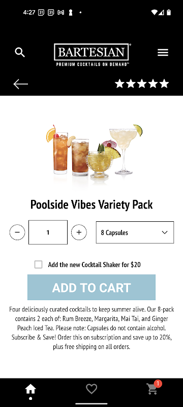 Ordinare le tue capsule preferite per il tuo Bartesian® Craft Cocktail Maker non è mai stato così facile! Scarica oggi e acquista il nostro intero menu di oltre 40 cocktail. Nessuna ricetta, nessuna miscelazione, nessuna pulizia. Solo cocktail di alta qualità con la semplice pressione di un pulsante.