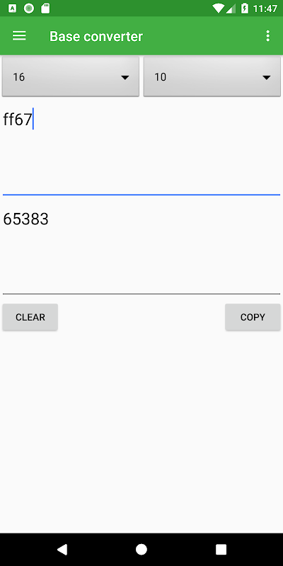 Puoi convertire tra basi selezionando la base "da" a sinistra e selezionando la base "a" a destra. Puoi quindi inserire il tuo numero e l'app la convertirà automaticamente.