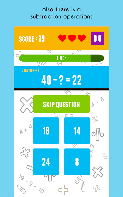 ➼ There are 5 types of games, addition, subtraction, multiplication, division and randomization of the 4 operations.