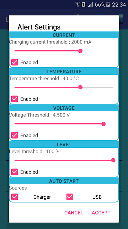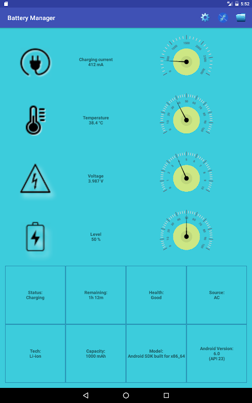 This app employs simple design to provide all battery properties in one glance. The following running parameters are provided in numeral and gauge views: