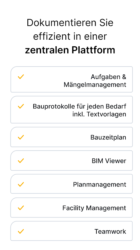 Gestisci i tuoi progetti in modo efficiente e assicurati il tuo vantaggio e la tua competitività utilizzando un'app di gestione delle costruzioni digitali. Con BauMaster come app per la documentazione edilizia è possibile registrare, gestire e condividere tutti i compiti e i difetti centralmente in un'unica piattaforma.