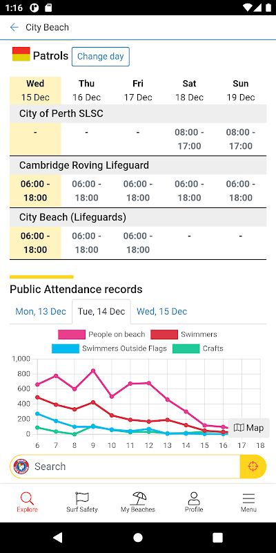• vedere rapidamente e facilmente se una spiaggia è sorvegliata da bagnini di surf o bagnini