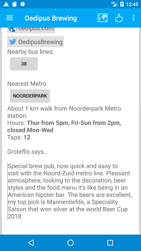 Each entry contains a review, photograph, nearest public transportation, contact info, website and twitter handle for each pub. Check the pub's twitter feed for news without leaving the app. A map will show the location of the pub as well as nearby listed pubs.