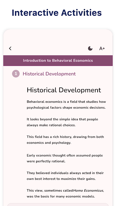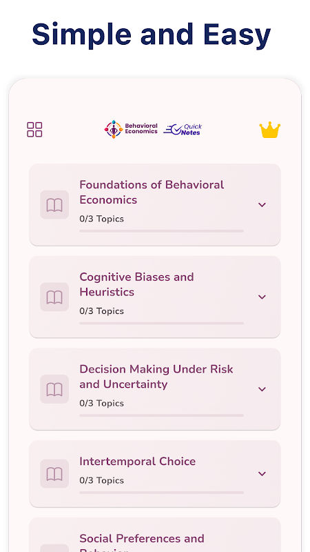 Padroneggia l'economia comportamentale con la nostra app completa, progettata per semplificare concetti complessi. Che tu sia uno studente, un aspirante economista o uno studente curioso, questa app offre spiegazioni chiare, domande interattive e accesso offline completo.
