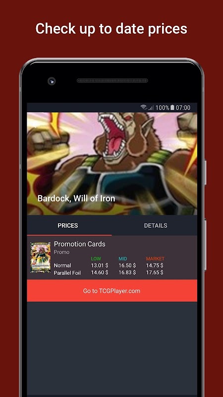 La tua app complementare per DBSuper. Scansiona istantaneamente le carte, controlla i prezzi aggiornati da TCGPlayer.com o Cardmarket.com e crea il tuo mazzo preferito!