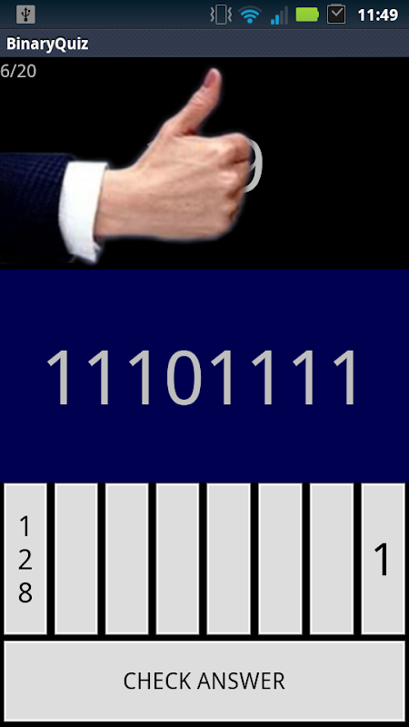 The app randomly generates a set of decimal numbers for you to attempt to convert to binary. Press the buttons to toggle the bits, then press check answer. If correct, you are rewarded handsomely and sent to the next question.