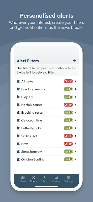 • NOVITÀ: filtri di avviso con opzioni migliorate come l'impostazione del raggio visibile che, combinato con il livello di rarità o specie o tipi di fauna selvatica specifici, ti consente di essere avvisato immediatamente quando viene trasmessa una notizia di tuo interesse