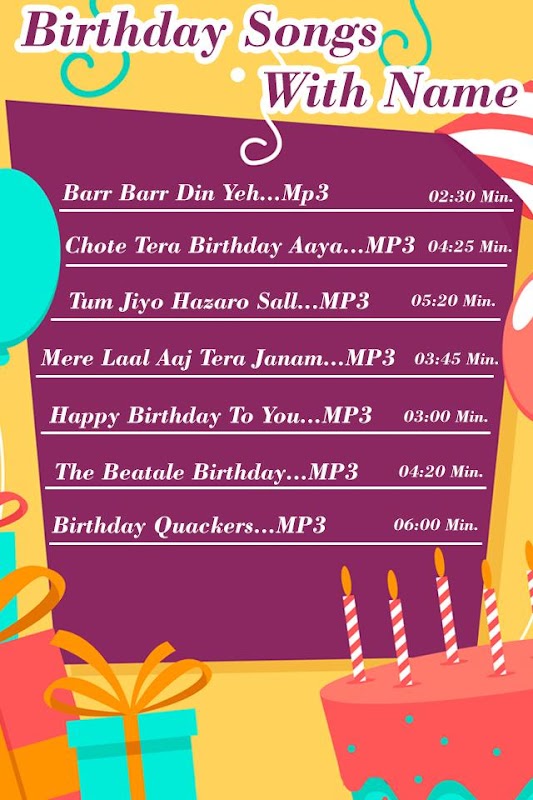 Collection of Different birthday song included in this app. My Name Birthday Song Maker is also same as birthday song maker, Birthday dp & status, birthday photo frame, birthday cake photo frame and birthday movie maker.Send the most exciting and original Happy Birthday singing Song wishes personalized with your friends and family member own name!