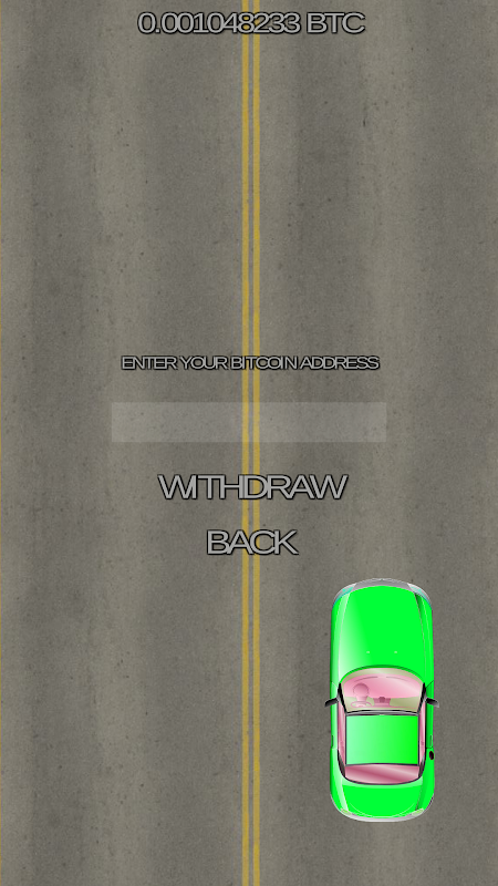 Bitcoin Race is a simple arcade that allows you to earn bitcoins. Just drive the car through the obstacles and receive reward. Get 0.000000003 BTC for every passed car and additional 0.000000010 BTC for every fifth car. Withdraw your funds once a payout threshold will be reached.