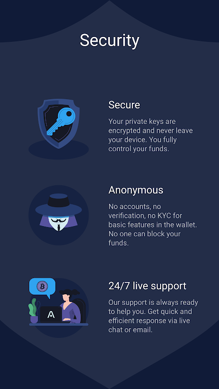 Atomic è un'applicazione completamente decentralizzata. Non memorizziamo nessuno dei tuoi dati, non richiediamo alcuna verifica per i servizi di base. Non abbiamo mai accesso ai tuoi fondi.