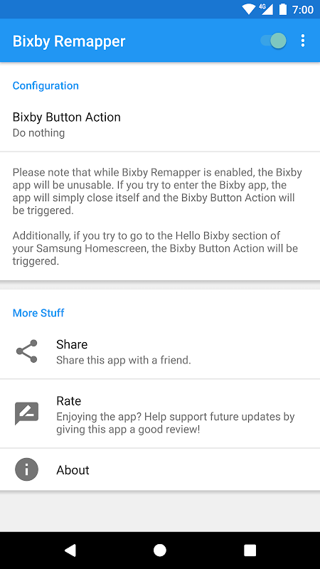 Questa applicazione è in qualche modo sperimentale! Esso consente di rimappare il pulsante Bixby sul Galaxy S8 a qualcosa di diverso, beh, Bixby!