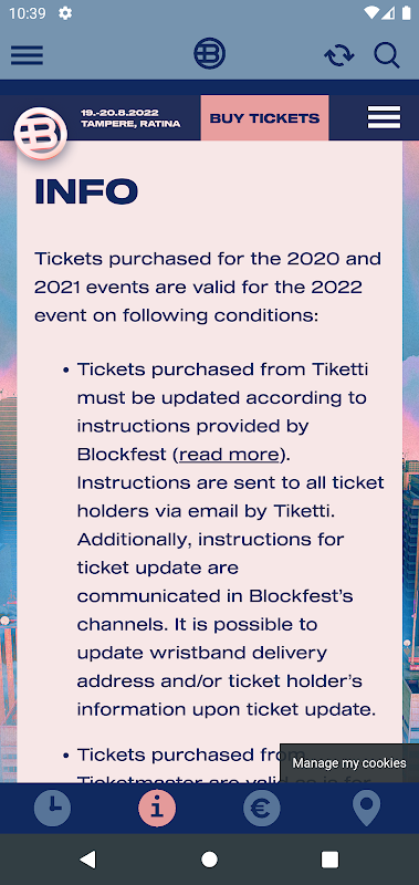 Nell'applicazione è possibile visualizzare un riepilogo di ad es. informazioni su artisti, area del festival e servizi. Puoi creare il tuo programma raccogliendo gli artisti che ti interessano nella pagina Preferiti nel tuo elenco.