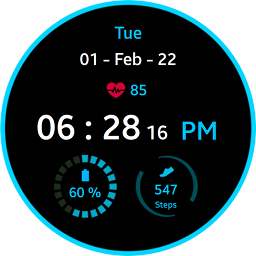Un quadrante ad anello blu che mostra l'ora, la data, la frequenza del battito cardiaco, il livello della batteria e il numero di passi, tutto in un colpo d'occhio. Il quadrante dell'orologio fornisce un indicatore quando la batteria è scarica modificando l'anello percentuale della batteria e cambiando l'anello del quadrante. Ti mostra anche un indicatore se hai raggiunto il tuo obiettivo di fitness cambiando il conteggio dei passi in verde. Il quadrante supporta 00:00/24:00 e 24 ore. Progettato per Wear OS con funzionalità di visualizzazione sempre attiva.