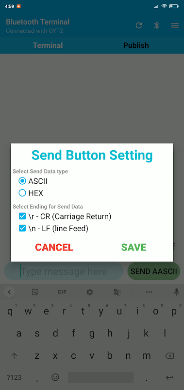 - By default, \r\n will be sent on every sending data and It can be changed from long pressing of particular Button.