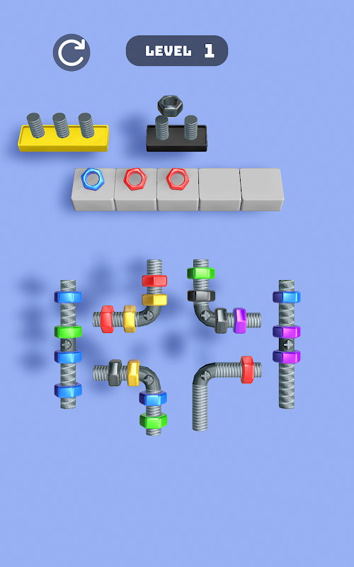 Ogni livello presenta una nuova serie di bulloni e dadi, intrecciati in formazioni complesse. Il tuo obiettivo è svitare strategicamente e abbinare le coppie corrette, assicurandoti che ciascun dado venga ruotato nell'ordine giusto per adattarsi al bullone corrispondente. Man mano che trovi gli abbinamenti perfetti, i pezzi in eccesso cadono, rivelando una tabula rasa e aprendo la strada a nuovi puzzle.