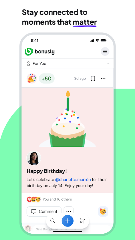 Scopri team più forti e culture migliori con Bonusly, la piattaforma di riconoscimento che mette al primo posto la connessione, la motivazione e le prestazioni, tutto a portata di mano. Invia riconoscimenti, riscatta premi, organizza incontri individuali e rimani in contatto con il tuo team, ovunque tu lavori. Bonusly per Android funziona con qualsiasi account Bonusly attivo.