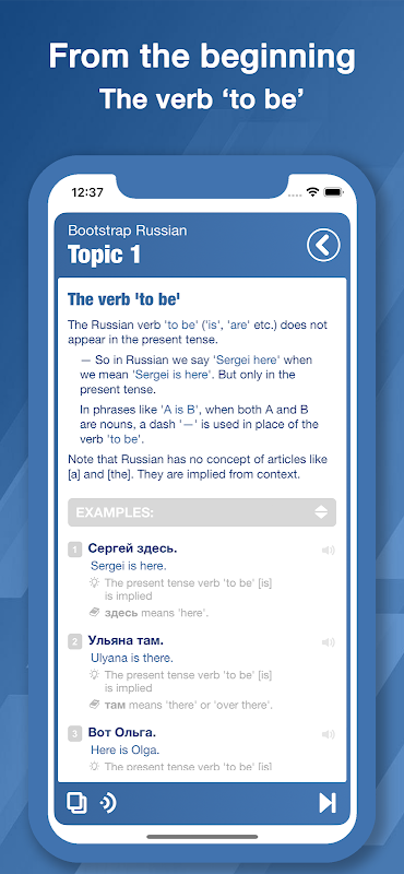 Ogni argomento include una spiegazione approfondita della grammatica e poi tanti esempi che illustrano la grammatica. Ogni esempio include una traduzione in inglese, nonché note che evidenziano come ogni esempio illustra la grammatica dell'argomento, nonché il significato delle nuove parole russe.
