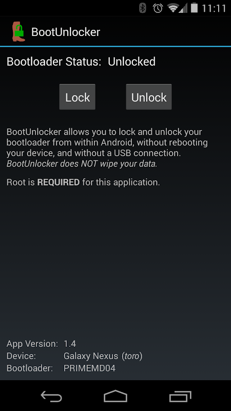 BootUnlocker per dispositivi Nexus ti permette di avere il meglio dei due mondi utilizzando privilegi di root per sbloccare il bootloader da dentro Android, senza cancellare i dati. Ciò consente di mantenere il bootloader bloccato per la sicurezza, con questa applicazione protetta sicuro dietro la password lockscreen. Ogni volta che si desidera sbloccare o ribloccare il bootloader, basta sbloccare lo schermo ed eseguire BootUnlocker.