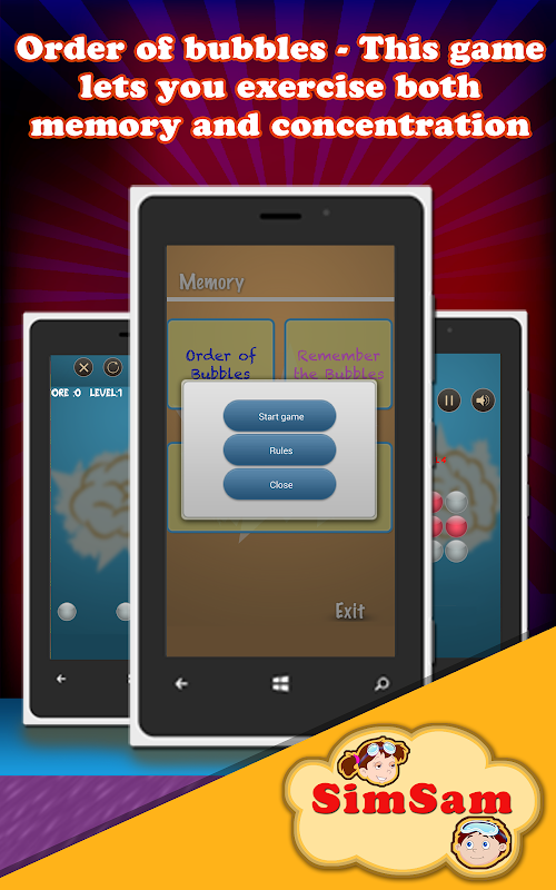 Come si gioca a questo gioco, è possibile costruire su diverse competenze mentali. 'Ricordo il Bubbles' 'Match - no Match', e 'sinonimo e Antonym' sono giochi che mettono alla prova le vostre abilità di memoria, mentre 'scoppiare la bolla' e 'Spot the bolla rossa' aiutare a sviluppare la concentrazione. E 'Trova il simbolo mancante' e 'maggiore o minore di' prova le tue abilità matematiche. Ordine di bolle - consente di esercitarsi sia la vostra memoria e capacità di concentrazione.