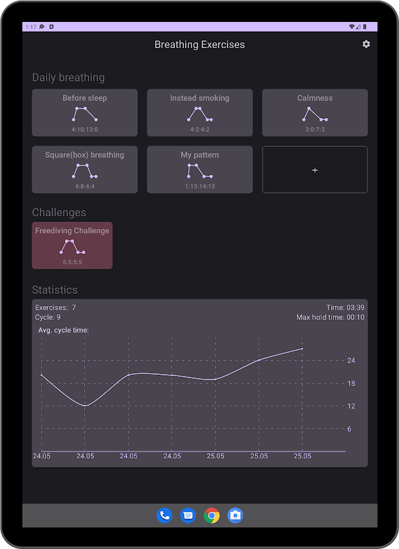L'applicazione contiene schemi di respirazione già pronti, ma puoi anche comporre le tue tecniche con i giusti valori delle fasi del respiro.