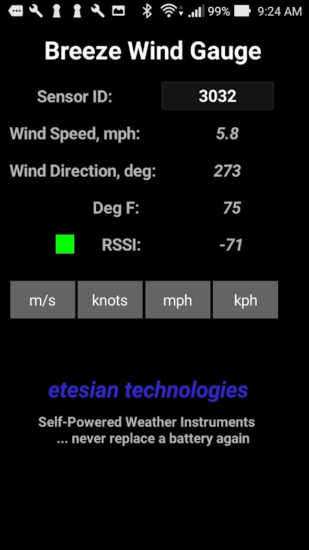 The app displays windspeed from an Etesian Technologies wireless Bluetooth LE cup anemometer. All functionality of the app is on a single screen. The user enters the sensor ID to select the proper sensor. This is required in the event that more than one Etesian Bluetooth Smart sensor is located within range of the iPhone.