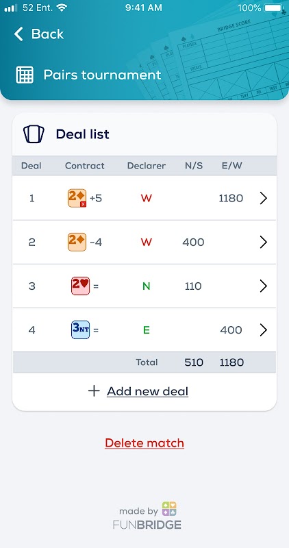 Scopri Bridge Score, il tuo assistente essenziale per valutare i punteggi di tutti i tuoi contratti di bridge e salvare le tue partite.