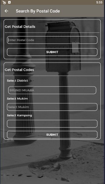 Applicazione dei servizi postali del Brunei per il monitoraggio di pacchi e invii postali e l'individuazione dei codici postali per aree selezionate