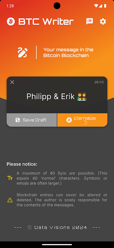 Questa app è uno strumento che utilizza OP_RETURN per scrivere fino a 40 byte di testo UTF8 (circa 40 caratteri) nella blockchain bitcoin. Da quel momento in poi, il tuo messaggio potrà essere visto pubblicamente per sempre con qualsiasi blockexplorer e diventerà parte della storia di bitcoin.