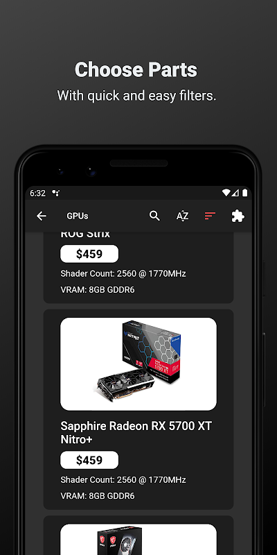 • Scegli le parti del PC e aggiungile a una quantità illimitata di build personalizzate, che vengono archiviate localmente e disponibili offline.