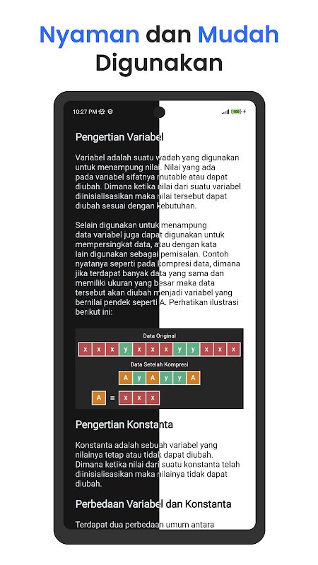 In questa applicazione Algorithm and Programming Learning Book, gli studenti possono scegliere facilmente il materiale che desiderano apprendere. Con questa applicazione del libro di apprendimento degli algoritmi e della programmazione, gli studenti possono studiare facilmente ed efficacemente, sempre e ovunque, senza doversi preoccupare di portare libri spessi. Questa applicazione è adatta per essere utilizzata come mezzo di apprendimento autonomo o come supporto per l'apprendimento in classe.