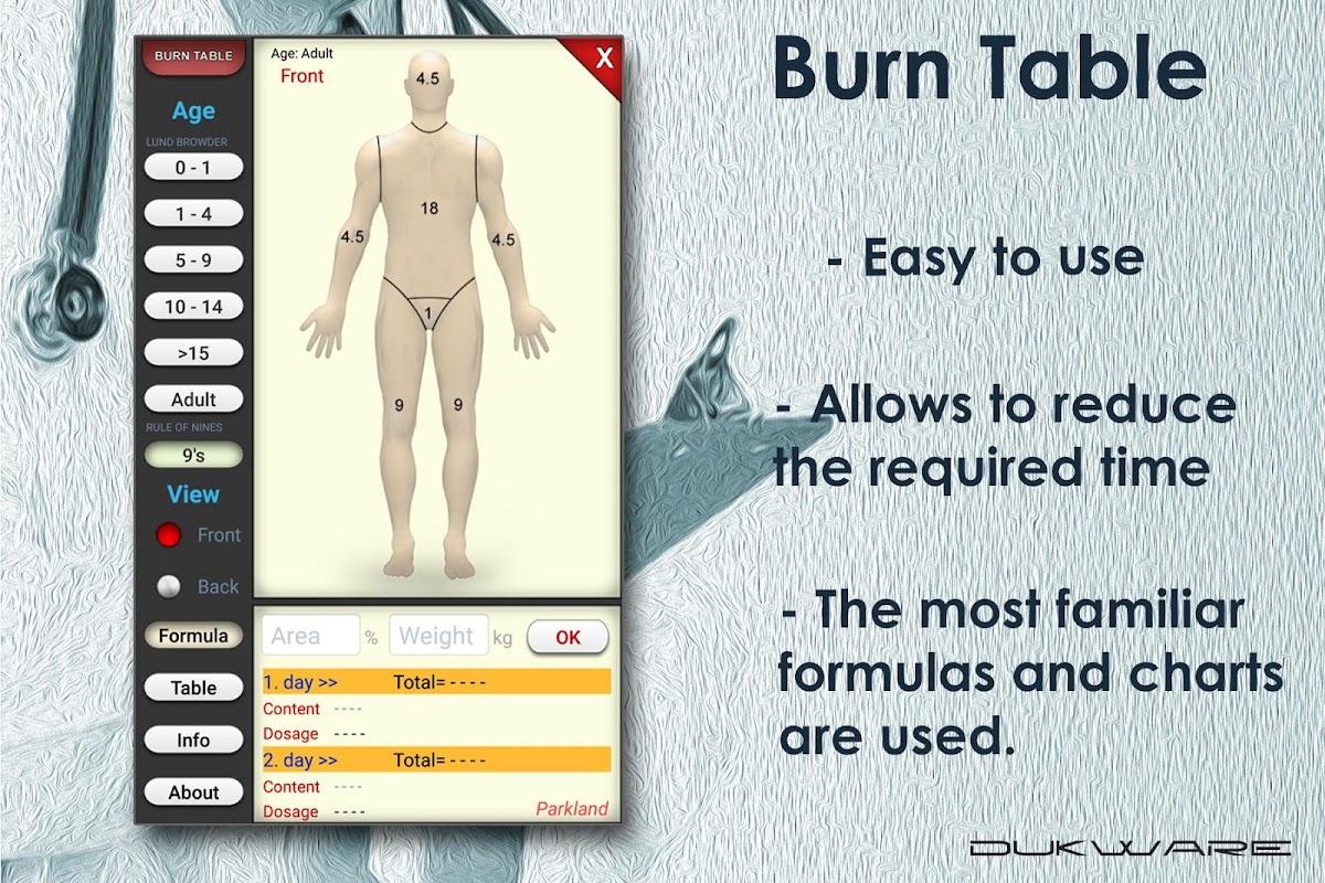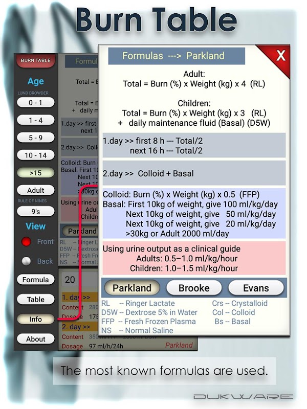In questa forma di realizzazione la combustione Parkland rianimazione fluido è stato calcolato usando la formula Brooke e Evans.