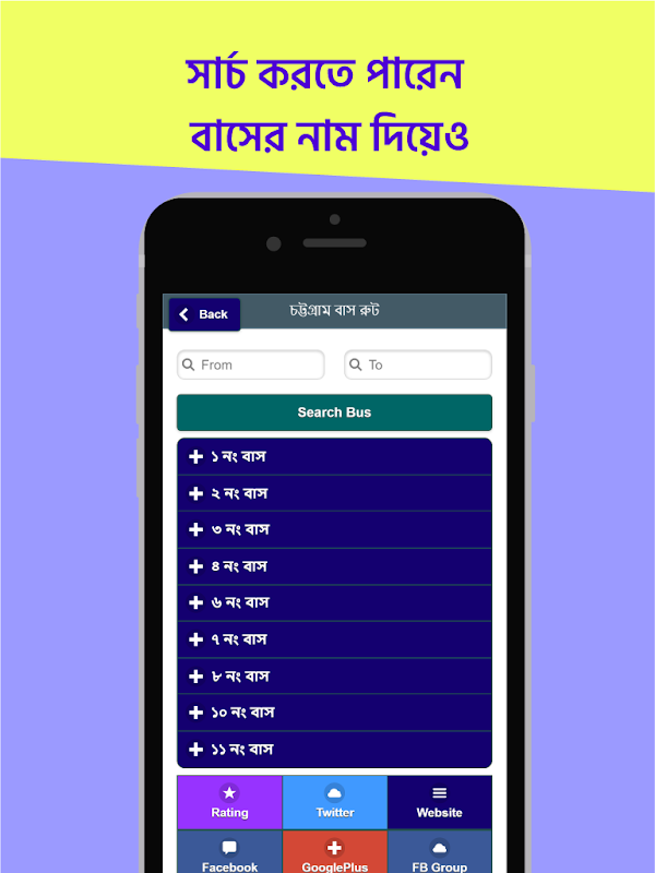 Ctg bus service is regularly needed android app. This bus route app contains all the name and route of bus services in Chittagong. You can find name of any local or sitting/counter bus of Chittagong using this bus service app. Many of us have map of Bangladesh. If you look at bd map, Chittagong is at the center of Bangladesh map. If you take a look at Chittagong city map, Chittagong city is a mega town. There are too many roads and ways, thousands of bus services including sitting service and local bus. But without a local bus timetable app you will fail to find the right bus. But this Bangla android app can save you providing list of all the bus route. You can search for a particular bus or a specific place. In the near future we will add all Bangladesh bus and intercity bus fare list. This will work similarly as bus ticket booking, train ticket and schedule in BD by railway apps.